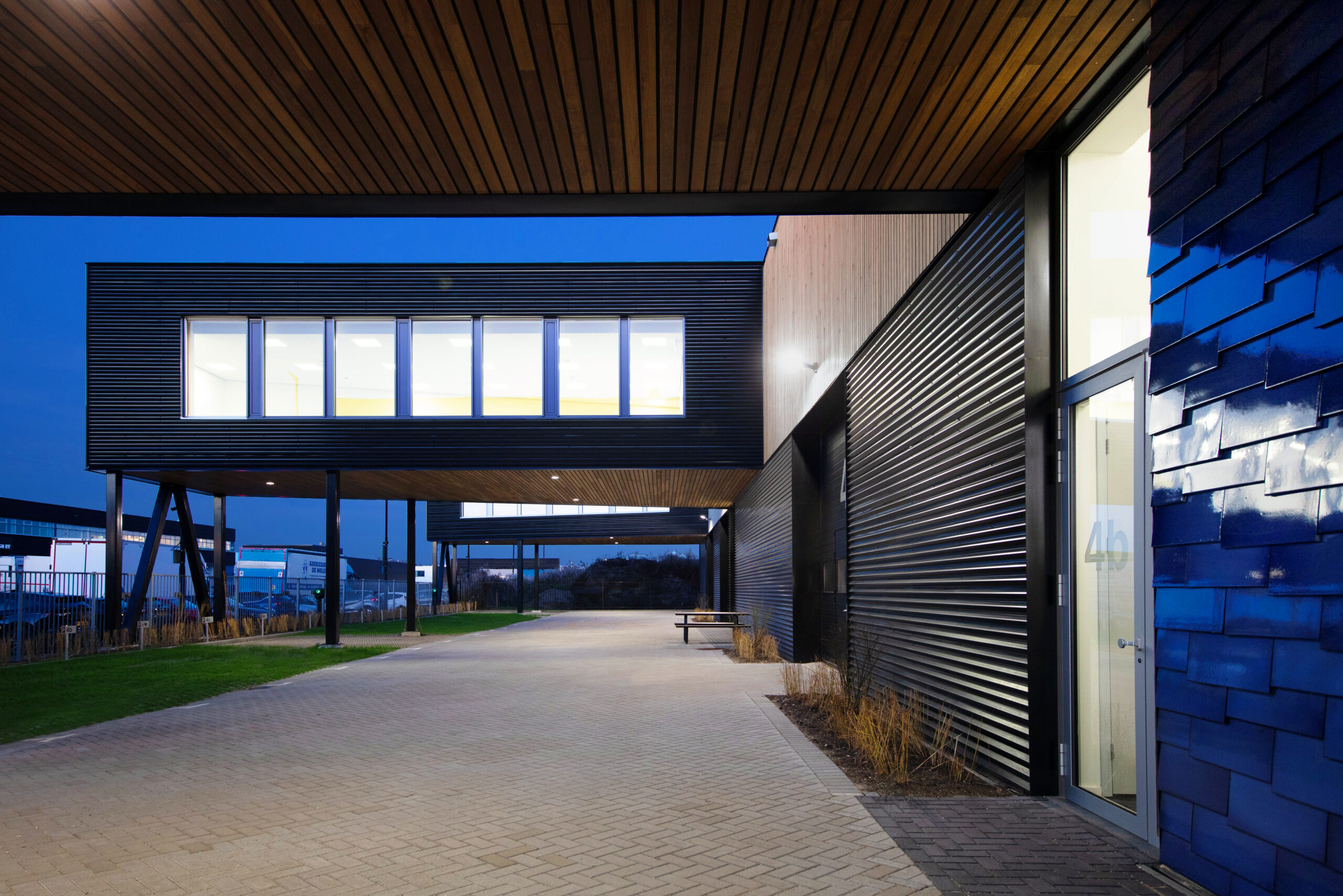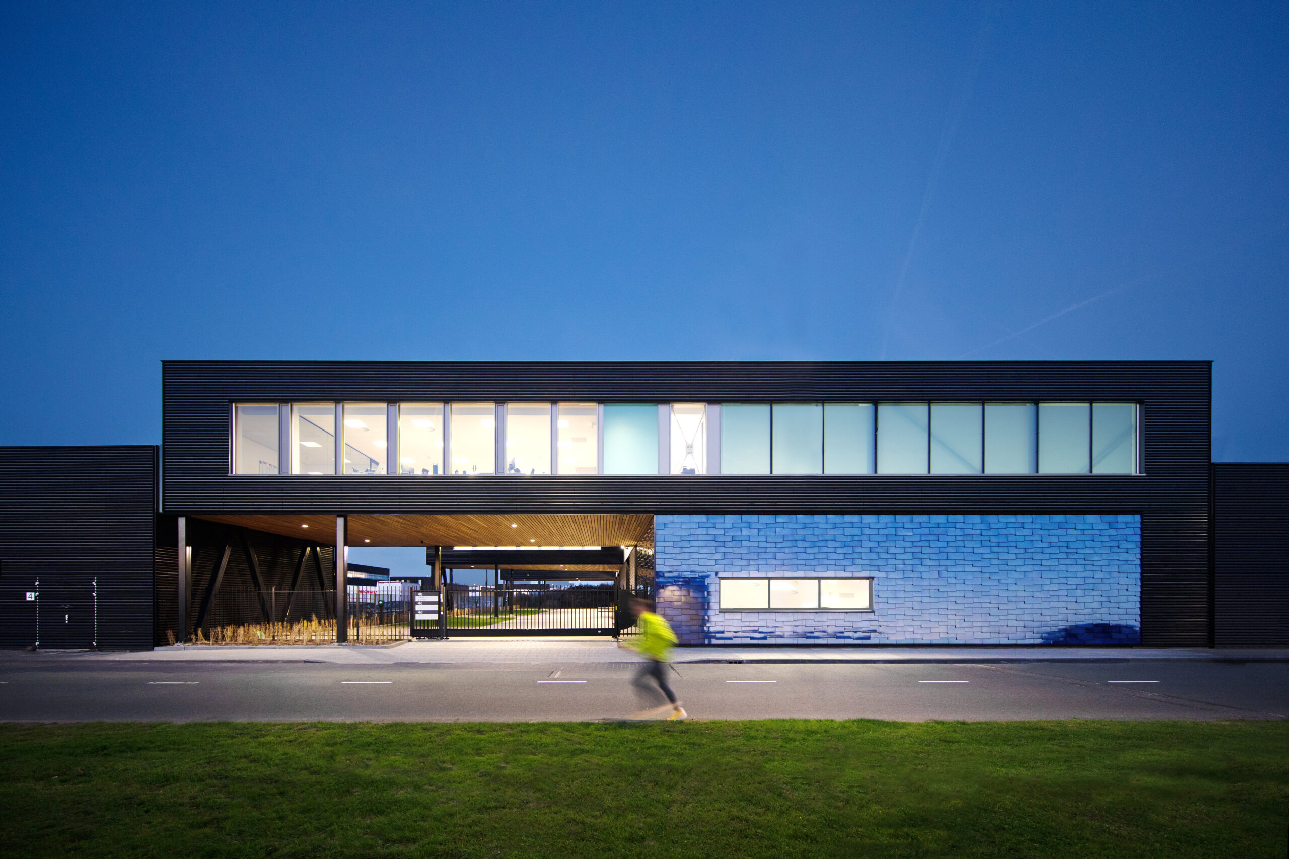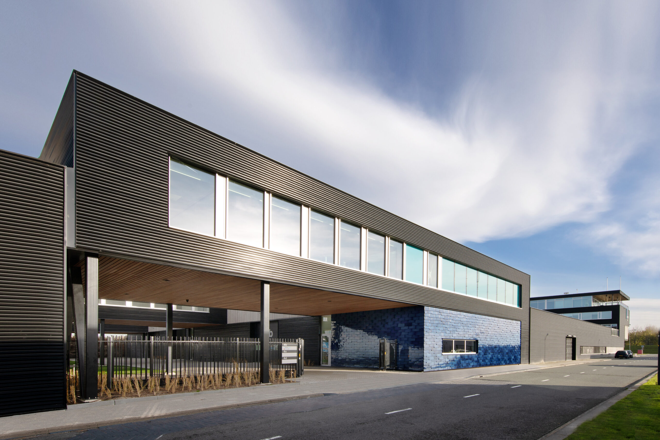 Sinds 1995 ontwerpen wij met veel plezier hoogwaardige bedrijfspanden voor de ontwikkelaar Tichelaar. De panden blijven meestal in eigen beheer, door de onderscheidende verschijningsvorm zijn ze vaak als eerste verhuurt. In de loop der jaren zijn een tiental gebouwen door ons voor hen gerealiseerd. Dit keer, op het bedrijventerrein van Rotterdam The Hague Airport, wilde Tichelaar het onderscheid maken met een gevel die deels bekleed is met prachtige tegels van naamgenoot de Koninklijke Tichelaar te Makkum.